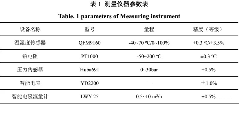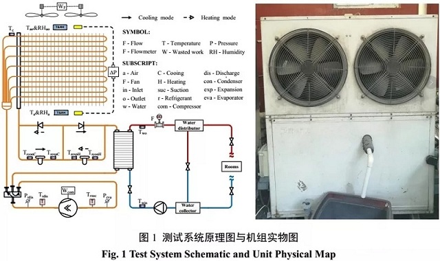 測試系統(tǒng)對空氣源熱泵的空氣側(cè)、制冷劑側(cè)與制取熱水側(cè)的運(yùn)行參數(shù)以及能耗情況進(jìn)行實(shí)時(shí)監(jiān)測。測試機(jī)組原理圖與實(shí)物圖如圖1中所示,在壓縮機(jī)吸/排氣管上分別設(shè)有溫度和壓力傳感器監(jiān)測壓縮機(jī)的吸/排氣溫度和壓力,在水側(cè)利用鉑電阻PT1000測量機(jī)組的進(jìn)/出水溫度,利用電磁流量計(jì)測量水流量。其中主要的測量儀器參數(shù)如表1所示。