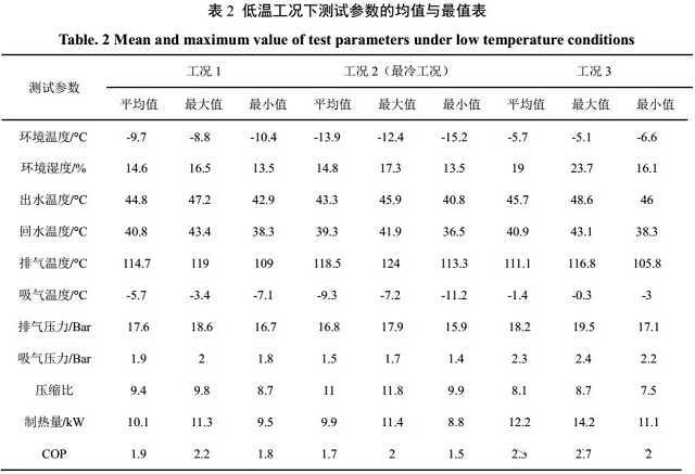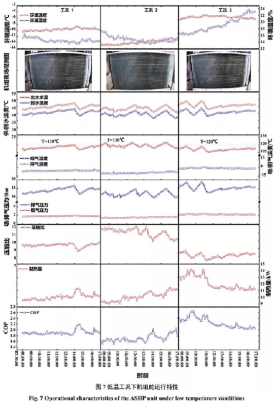(3)最冷工況下,環(huán)境溫度均值-13.9℃,壓縮機(jī)平均排氣溫度為118.5℃,最高達(dá)到124℃,且機(jī)組有25%的時(shí)間其排氣溫度超過120℃,最高壓縮比達(dá)到11.7;運(yùn)行期間機(jī)組頻繁發(fā)生“無霜除霜”的誤除霜事故以及頻繁停機(jī)的運(yùn)行故障,機(jī)組的平均制熱量僅為9.9kW,COP為1.71,當(dāng)溫度低至-15.2℃時(shí),制熱量衰減幅度高達(dá)55%,COP僅為1.49?梢,低溫嚴(yán)重影響熱泵的正常運(yùn)行。