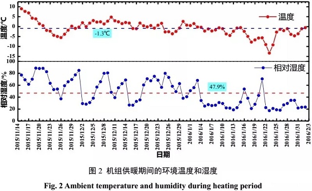 測試期為2015年11月15日至2016年2月2日。為詳細(xì)考察空氣源熱泵在測試期內(nèi)的運(yùn)行性能,尤其在低溫工況下的性能,全面測試了室外溫濕度,壓縮機(jī)吸排氣溫度和壓力、機(jī)組制熱量、能耗和COP等參數(shù),并對相關(guān)的參數(shù)進(jìn)行整理分析。