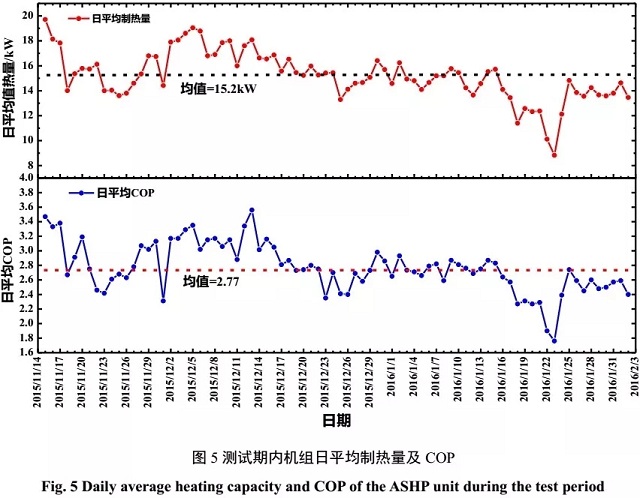 圖5為測試期內(nèi)機(jī)組的日平均制熱量和日平均COP具體情況。