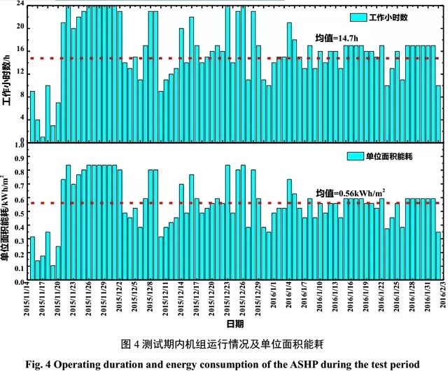 圖4為測試期內(nèi)空氣源熱泵每天的運(yùn)行時(shí)間和單位面積能耗。
