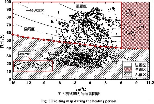 由圖可知,隨著供暖期的推進(jìn),環(huán)境溫度呈下降趨勢,在2016年1月23日達(dá)到最低溫度;相對濕度變化幅度較大,測試中后期,環(huán)境相對濕度較低,北京氣候呈現(xiàn)“干冷”的特點(diǎn)。為直觀獲得測試期內(nèi)機(jī)組不同運(yùn)行工況下的結(jié)霜和結(jié)露情況,根據(jù)朱佳鶴[23,24]等人提出的多區(qū)域結(jié)霜圖譜,得出如圖3所示的結(jié)霜工況分布圖。