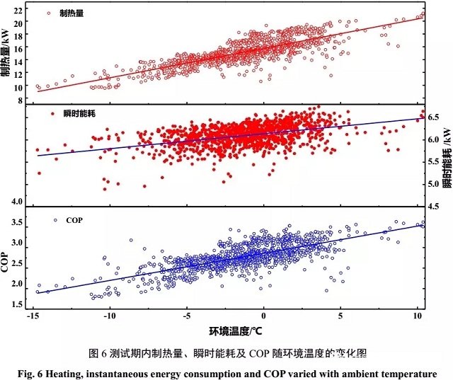 圖6為不同環(huán)境溫度下機(jī)組制熱量、瞬時(shí)能耗和COP的變化情況圖。