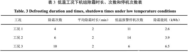 由此可見,低溫導(dǎo)致壓縮比超過正常范圍,對壓縮機(jī)的正常運(yùn)行產(chǎn)生了顯著的影響。機(jī)組除霜頻次及停機(jī)故障。機(jī)組除霜時(shí)長、次數(shù)及停機(jī)故障次數(shù)如表3所示。