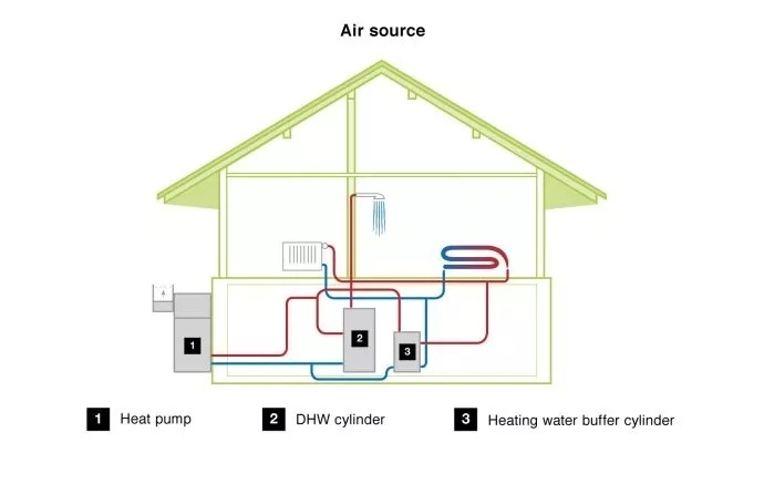 1. Heat pump(熱泵) 、2. DHW cylinder( Domestic Hot Water cylinder——生活熱水存儲罐)、3. Heating water buffer cylinder(供暖熱水緩沖存儲罐)